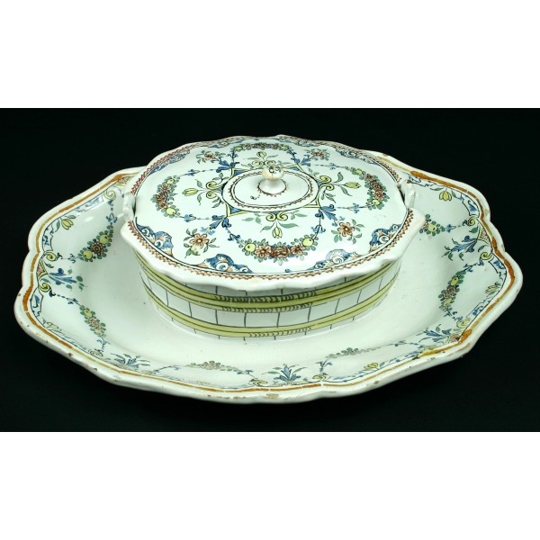 Ce beau beurrier, d'une contenance importante, adopte la forme traditionnelle des baquets de bois formés de douves retenues par un cerclage de joncs, modèle très apprécié et partout répandu depuis son apparition en Hollande. Posé sur un bel émail blanc crémeux, le décor élégant et léger adapte les motifs de la faïence de Rouen avec une polychromie moins vive et dans un style bien différent des productions rouennaises.
