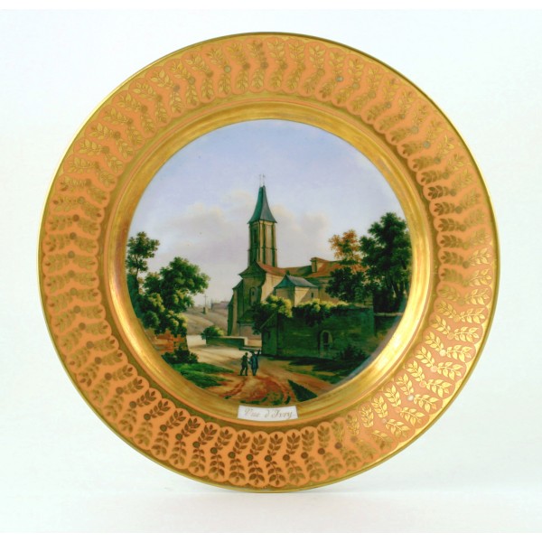 Le travail de Sèvres fut imité par les porcelainiers parisiens qui reprirent à leur compte les caractéristiques principales de ces services : aile à fond de couleur soutenue (ici la couleur « nankin », très à la mode entre 1820 et 1830), or abondant et bassin peint en plein. Dans le cas présent, il s'agit d'une assiette portant le n°82, issue d'un luxueux service consacré, semble-t-il, à des vues de la région parisienne. La porcelaine fabriquée à Champroux dans l'Allier pour le négociant Edouard Honoré, qui faisait peindre les pièces dans son atelier parisien, n'a pas l'extrême finesse de la pâte de Sèvres, mais l'objet est d'un très haut niveau. La qualité de l'or, la finesse de la peinture, même si elle reste inférieure à celle de Sèvres, la présence d'un filet doré sur le talon et le nombre très important d'assiettes envisageable d'après le numéro d'ordre inscrit sur celle-ci, témoignent d'une commande exceptionnelle passée auprès de la maison Honoré, l'une des plus importantes de la capitale au début du XIXe siècle.