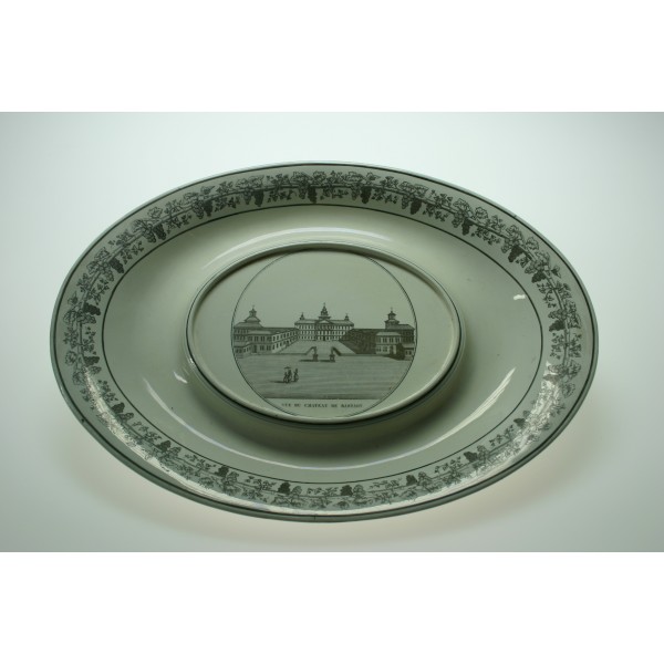 Cette terrine néo-classique, dont la pureté des lignes est soulignée par la finesse du matériau, très plastique, reprend un type d'orfèvrerie britannique adapté pour la céramique par le célèbre Josiah Wedgwood dans les années 1780. Le décor par transfert d'impression, technique mise au point en Angleterre vers 1750 mais dont l'exploitation commerciale ne commença en France qu'en 1808, représente des vues du château de Rastadt et de la ville de Karlsruhe, domaines du grand-duc de Bade, admirateur de Napoléon et allié de la France jusqu'en 1813.