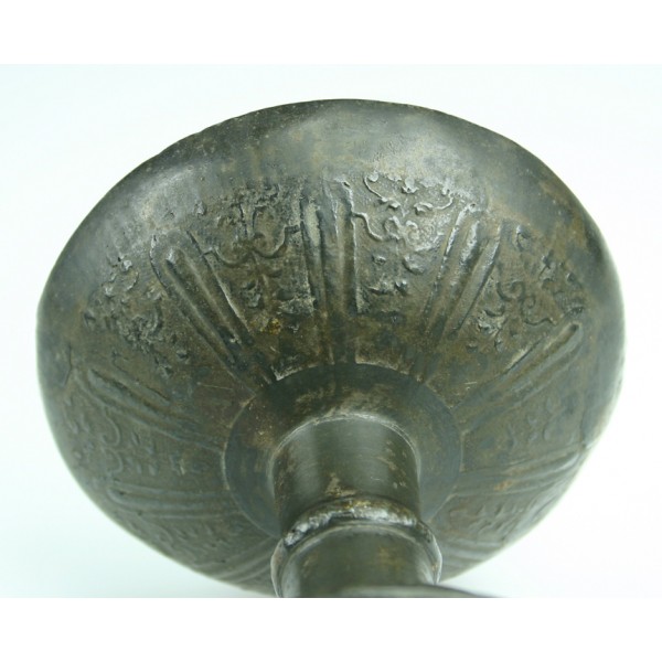 Malgré les apparences, il s'agit d'un objet domestique civil et non d'un vase sacré. On ne distingue en effet aucune croix, détail obligatoire sur les calices du culte catholique. Par ailleurs, la coupe est trop basse et trop étroite pour contenir le vin consacré sans risque d'accident. Le léger décor de volutes et feuillages symétriques en chute, séparés par des godrons, est de style lyonnais et donne une possible indication de provenance.