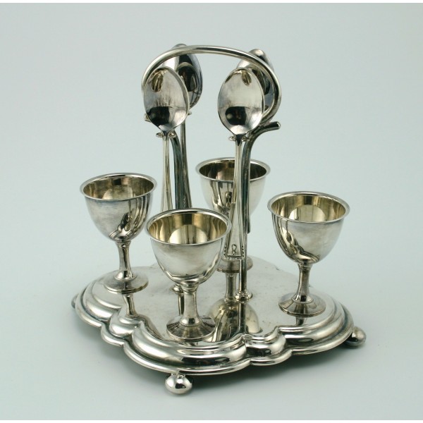 Il existe une infinité de formes, de modèles et bien entendu de styles, pour ces porte-coquetiers indissociables du déjeuner à l'anglaise. Le type le plus commun, tel celui-ci, comporte un socle avec système de préhension, où les coquetiers sont fichés sur des tenons et les cuillères suspendues. Certains porte-coquetiers peuvent être associés à un plateau de service, une salière en forme de coupe. Encore moins courante est la combinaison de l'objet avec un porte-toasts.