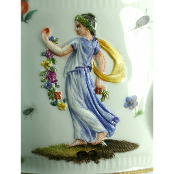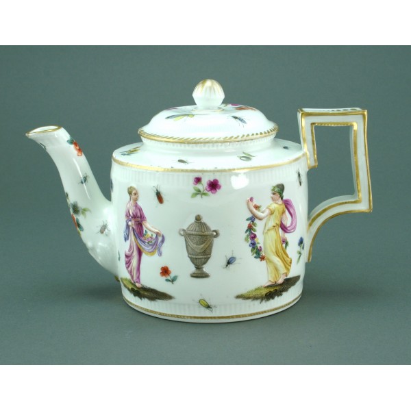 Lorsque le comte Camillo Marcolini prit les rênes de la manufacture de Meissen en 1774, celle-ci avait déjà perdu le rayonnement qui fut le sien jusqu'au milieu du XVIIIe siècle. Le nouvel administrateur aiguilla la production vers les formes néoclassiques qui triomphaient en Europe. Ce goût est bien visible sur la théière, munie d'une anse "à la grecque". Le décor, en revanche, se veut moins archéologique, plus aimable. Il combine des figures féminines en relief, non émaillées et peintes au naturel, marchant vers une urne qu'elles paraissent vouloir orner de fleurs, et un semis de fleurettes et d'insectes typiques des produits courants de Meissen au XVIIIe siècle.
