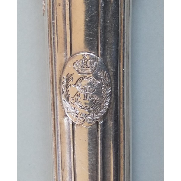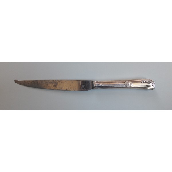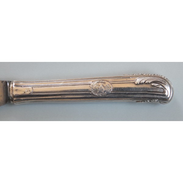 Ce beau couteau plein manche fait partie d'un ensemble de couverts en argent et argent doré ayant appartenu à Catherine II de Russie, dont différents lots sont passés en vente publique en 1986, 2003 et 2010. La fabrication parisienne est attestée par les poinçons de charge (une herse), décharge (une coquille) et jurande, mais aucun poinçon d'orfèvre n'a été repéré.