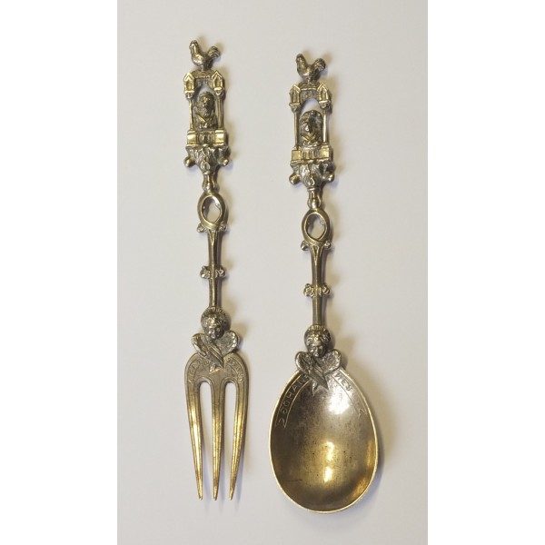 Cette cuillère et cette fourchette sont typiques de l'adaptation des formes et ornements néogothiques aux objets utilitaires modernes, pratiquée à cette époque. L'entreprise Neresheimer, fondée à Hanau en 1890 et à laquelle ces pièces sont actuellement attribuées, fut avec celle d'August Schleissner l'une des deux plus prospères. Les exportations d'orfèvreries allemandes de style XVIe et XVIIe ont été considérables vers le Royaume-Uni qui appréciait les monumentales et somptueuses pièces d'ornement, traditionnellement déposées sur les buffets d'apparat des salles à manger (sideboard pieces).