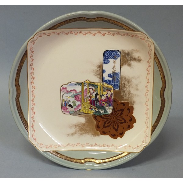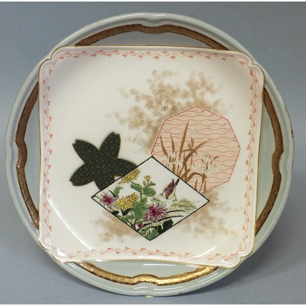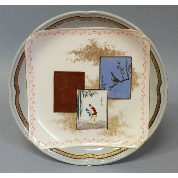 Sur le napperon sont déposées, en léger relief également, des vignettes rectangulaires, des formes d'éventail ou qui évoquent celles des tsuba (les gardes des armes blanches japonaises), garnies de motifs variés, d'interprétations de peintures de fleurs et d’oiseaux, de scènes et de paysages. Contrastant par le dessin et les couleurs, elles semblent flotter sur un fond d'or poudré et se superposent. Il s'agit d'un jeu esthétique employé par les graveurs japonais, appelé kibori gakuawase sanzu (« rivalité des images encadrées »). L'auteur du service a assimilé ce principe et l'a rendu avec une rare sensibilité.