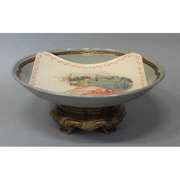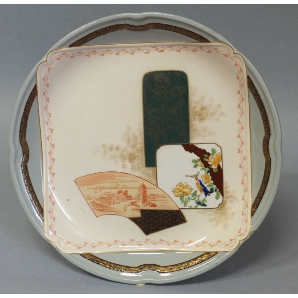 Expression majeure et aboutie du japonisme en France, ce service est un jalon dans l'histoire des arts de la table français, aussi le musée se devait-il d'en présenter quelques pièces. L'auteur du modèle, malheureusement anonyme, a choisi un fond coloré gris verdâtre rappelant les céladon tardifs (qui relèvent en fait de l'art chinois), bordé d'une frise de méandres dorée et sur lequel se détache en trompe-l’œil un linge carré qui semble brodé d'une légère guirlande végétale rose. Ce dispositif fait clairement référence aux « d'Oiley », ces petits napperons adoptés en France sous influence culturelle britannique et que l'on plaçait, dans la seconde moitié du XIXe siècle, sur les assiettes à dessert pour les isoler des couverts au moment où l'on servait.