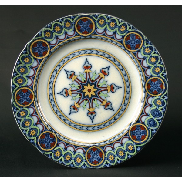 La manufacture de Samuel Alcock, l'une des principales entreprises du Staffordshire, fonctionna de 1828 jusqu'à la mort du fondateur en 1859. Aussi est-il difficile de préciser si cette assiette, dont la forme est écrasée par le décor un peu tapageur, appartient à l'époque (1830-1850) où les fabricants britanniques proposaient des produits éclectiques, parfois vulgaires et unanimement dénoncés lors de l'exposition du Crystal Palace de Londres en 1851, où si elle tente de coller à l'actualité esthétique postérieure à cette manifestation en profitant de la vogue néogothique affirmée. Un modèle aussi chargé, enrichi au pinceau, sur glaçure, de fragiles rehauts de couleurs claires et destiné à une clientèle de classe moyenne plus soucieuse d'opulence ostentatoire que de recherche dans le design, pourrait fort bien dater des années 1840.