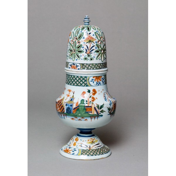 Objet de luxe, la saupoudreuse servait à table tout au long du repas. De nombreuses personnes appréciaient en effet de sucrer certains hors-d'œuvre (melons, figues...), puis les légumes à l'entremets après les viandes rôties (parfois elles-mêmes sucrées), enfin les fruits au dessert. Sur cet exemplaire rouennais, le décor de chinoiserie composé de pagodes dans un paysage exotique devant un plan d'eau, ainsi que les croisillons verts, sont typiques de l'atelier Guillibaud-Levavasseur.