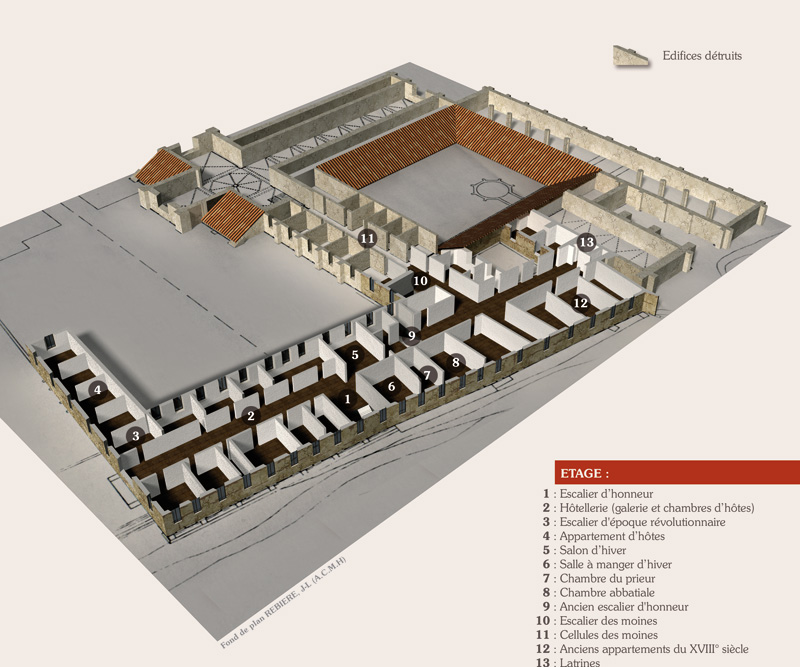 On the east side is the huge vaulted grain store measuring 480 m². The floor above contains the former guest rooms laid out along an immense gallery, the winter lounge and dining room, the Prior's room, the symbolic room of the Abbot, the corridor with the monks cells, as well as the apartments refurbished in the 19th century.